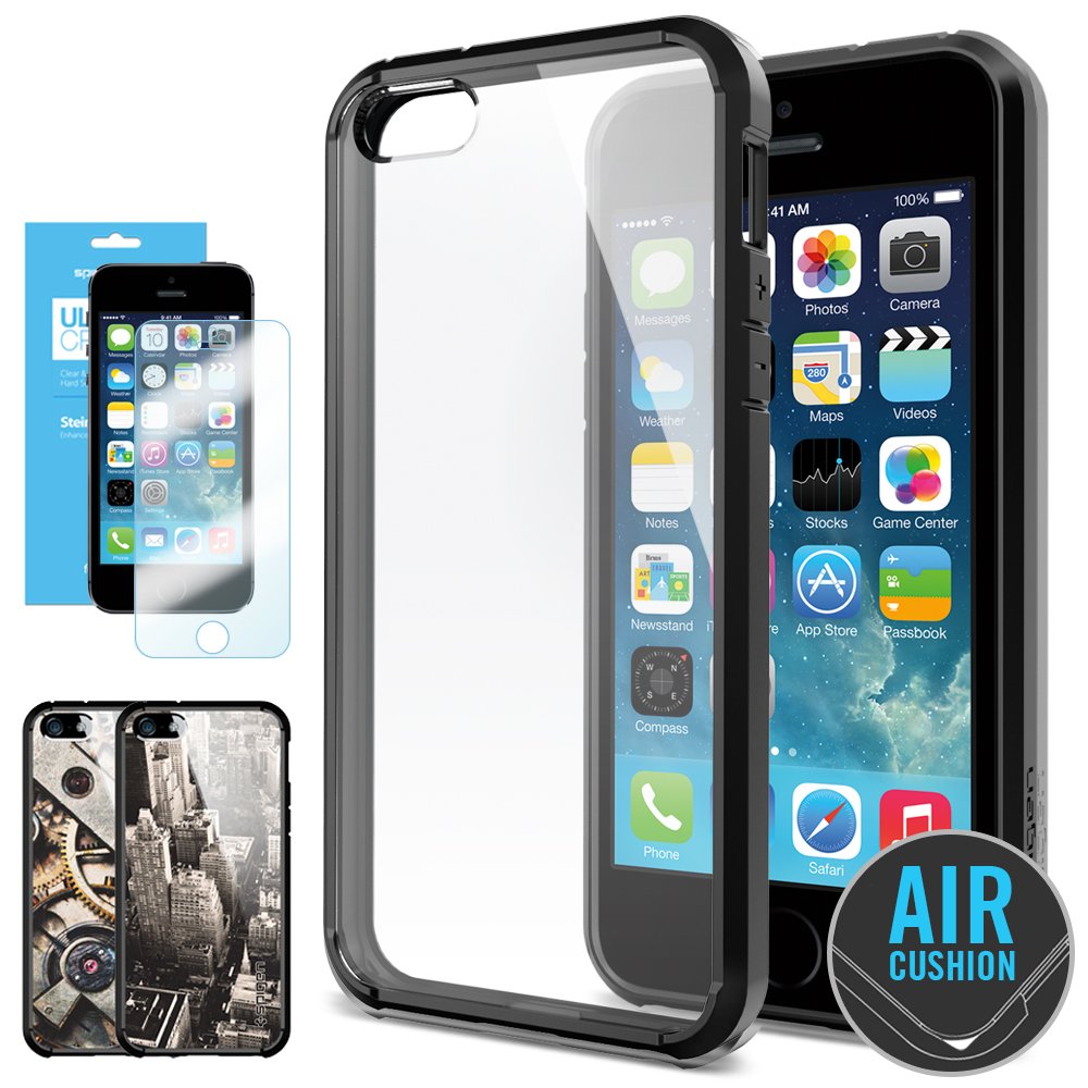 SPIGEN iPhone 5S Case Bumper **NEW Release** [Ultra Hybrid] [Black] FREE Screen Protector + 2 FREE Design Graphics Included Bumper with CLEAR Back Panel for iPhone 5S / 5 - ECO-Friendly Packaging - Black (SGP10515)